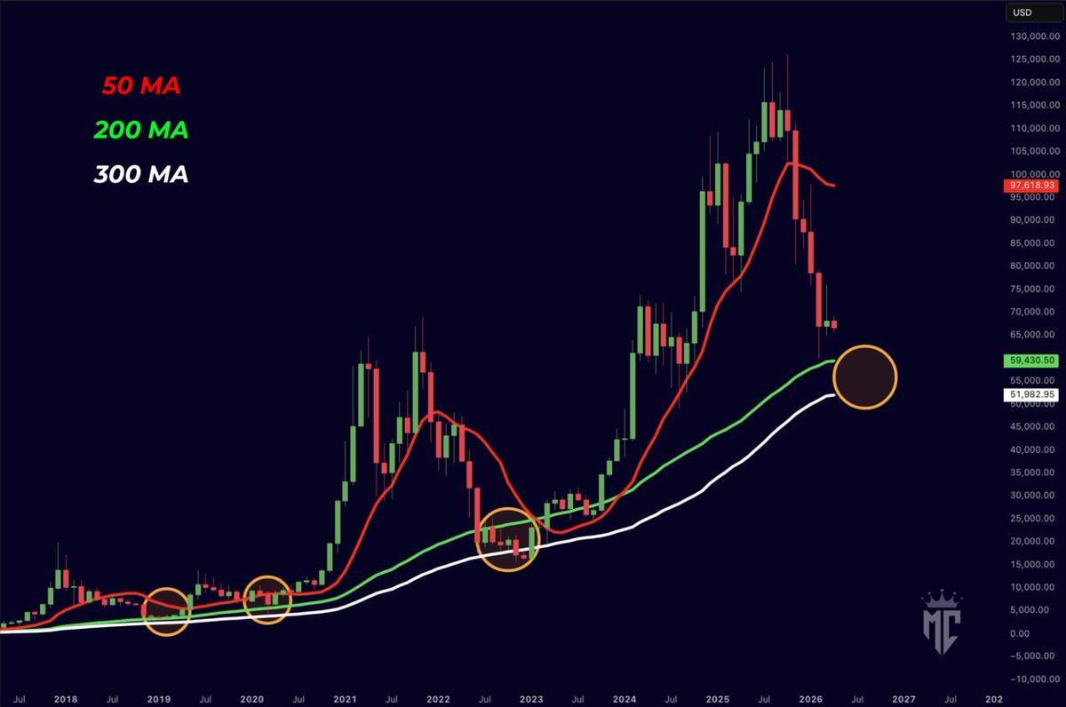 The bottom for Bitcoin may not have been reached yet. Historical data suggests that bottoms often appear near the 200 and 300-day moving averages. We are currently far from these levels.