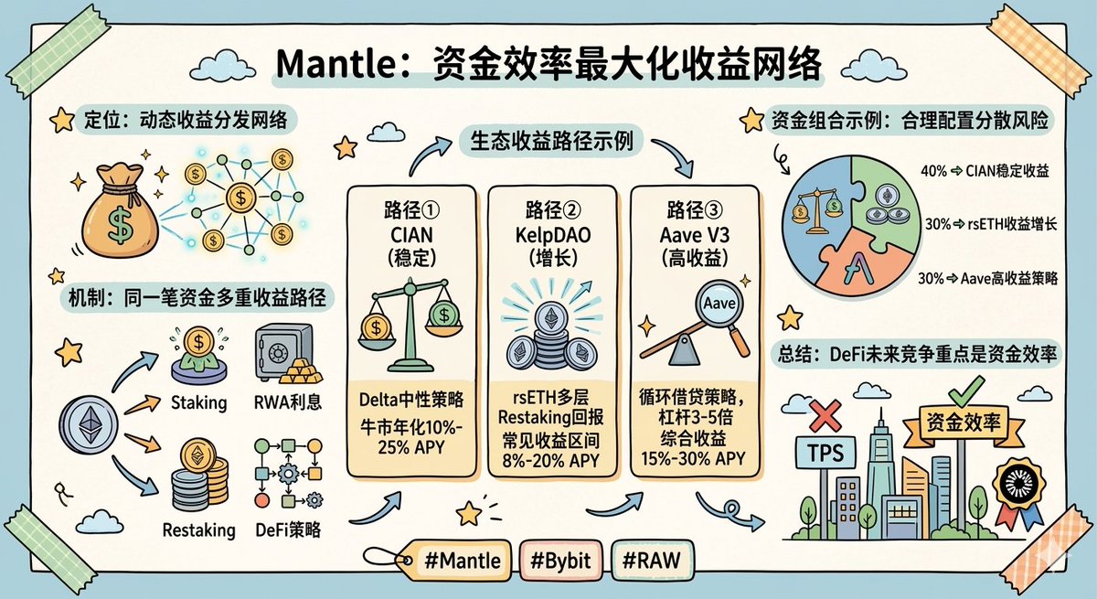 Mantle is maximizing on-chain capital efficiency. If we still use traditional metrics like TPS and Gas to measure @Mantle_Official, its core value is easily underestimated. Unlike many public chains that simply pursue TVL (Total Value Limit), Mantle is building itself into a dynamic "on-chain yield distribution network." Its core logic isn't about passively storing bridged funds, but about enabling each investment to continuously generate multiple yields on-chain through higher capital efficiency. 🌟 How can funds be made more efficient on Mantle? The same investment can participate in multiple yield paths simultaneously, such as: 🔸Staking 🔸RWA Interest 🔸Restaking 🔸DeFi Strategies 🌟 What are the yield paths in the Mantle ecosystem? * For example, CIAN offers relatively stable returns through a delta-neutral strategy, achieving an annualized APY of 10%–25% in a bull market. * KelpDAO extends ETH returns to multi-tiered restaking rewards through rsETH, typically offering 8%–20% APY. * Aave V3's revolving lending strategy allows users to leverage their funds 3–5 times to pursue a combined APY of 15%–30%. A Common Fund Portfolio By strategically allocating different strategies, risks can be diversified while generating returns. For example: 40% ➜ CIAN stable returns 30% ➜ rsETH return growth 30% ➜ Aave high-yield strategy From a longer-term perspective, the future competition in DeFi may not only focus on TPS, but also on capital efficiency. @0xMantleCN This yield network model, which focuses on improving the efficiency of on-chain capital utilization, is likely to have increasingly apparent competitive advantages. #Mantle #Bybit #RAW