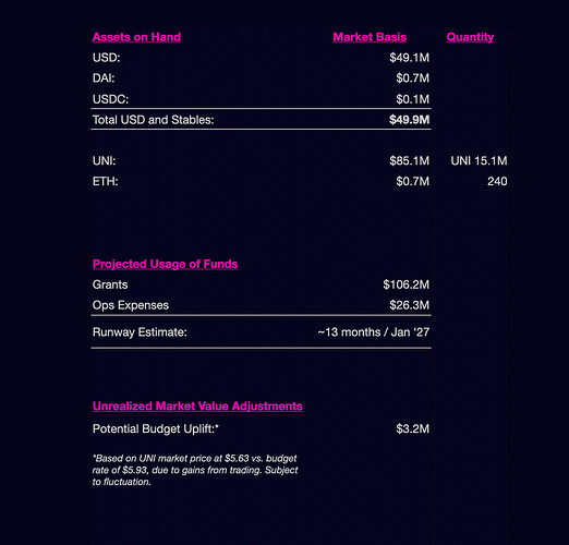 The Uniswap Foundation released its unaudited financial summary for fiscal year 2025, projecting that its current funding will support operations until January 2027. As of December 31, 2025, the Foundation held $49.9 million in cash and stablecoins, 15.1 million UNI tokens, and 240 ETH, with total assets of approximately $85.8 million at year-end prices. Of this, approximately $106.2 million is planned for grants and incentives, and another $26.3 million will be used for operating expenses and employee token incentives. Source:
