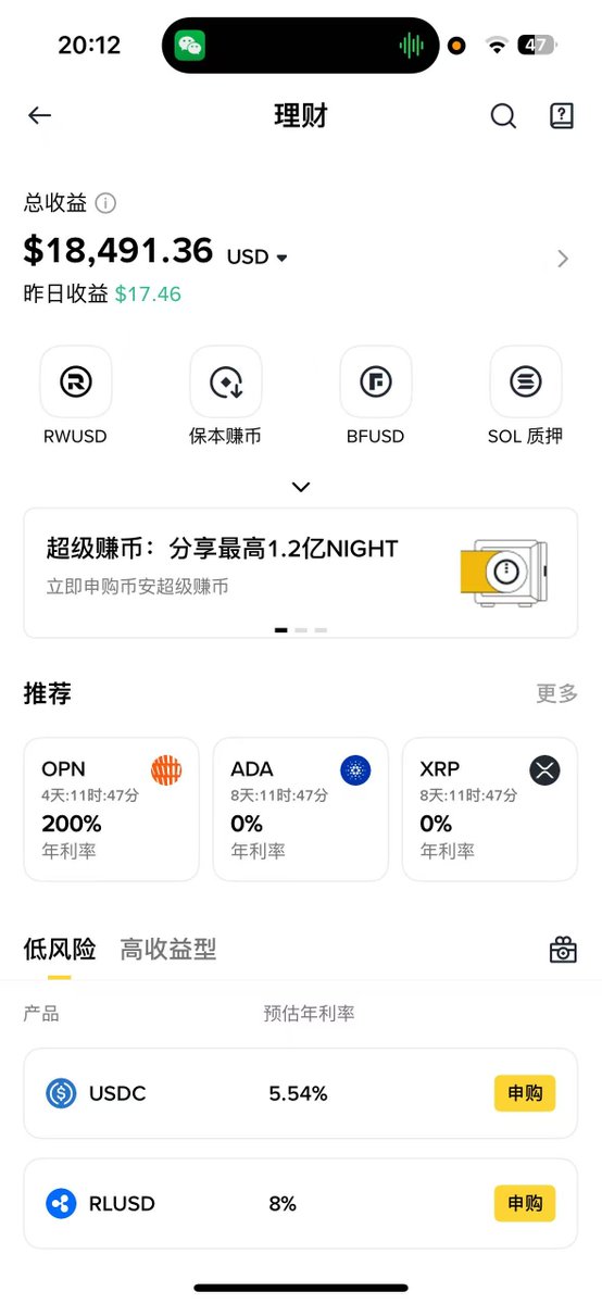 I participated in @binancezh's Super Earn Crypto event last night at 8 PM. I felt the market was showing signs of a rebound recently, so I bought all my spot holdings to participate. I bought a total of $135,500 worth of spot holdings and maxed out every subscription. Today, I checked and my profit is already $5,000. Let's see how much the interest plus the holding yield will be after the event ends. Currently, the $BNB and $BTC prize pools are sold out. There are still $WBETH, $BNSOL, $XRP, and $ADA pools available for subscription. If you have spot holdings and aren't in a hurry to sell, you can participate in the subscriptions to earn returns.