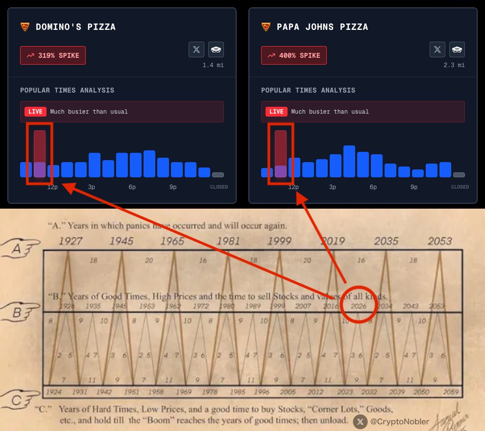 🚨WARNING: Something very serious is happening right now!! The Pentagon Pizza Index has just surged. Traffic near the Pentagon is 50% lower than normal. This is no coincidence. If you hold any assets right now, you must understand what's really happening behind the scenes: This perfectly aligns with what the market has been trying to reflect. The global geopolitical risk index has reached its highest level since 9/11. Now, you're seeing real-time signals from Washington indicating that escalation is no longer a tail risk. It's happening. US-Iran relations are no longer just "tense." They're heading towards direct confrontation. The market has already begun to react covertly. This is how things always start. Not with a headline everyone agrees on. But with subtle misalignments. Liquidity thins. Position shifts. Savvy investors exit before market sentiment fully explodes. Look at what's happening globally. Japanese stocks are starting to weaken. This is more significant than people realize. Japan is one of the world's largest providers of liquidity. When Japanese stocks fluctuate, it often signals pressure on global carry trades. And when these carry trades are unwound, risk assets feel the impact quickly. Meanwhile, we are seeing early signs of capital rotation. Equities are being quietly sold off. Cryptocurrencies are losing momentum as risk appetite weakens. This is not panic. This is a redistribution of funds. And everything always looks "normal" until it changes. Now, put all the factors together. → Extremely high geopolitical risks → Real signs of military escalation → High oil prices → Global markets begin to sell off This is no coincidence. In this situation, a single news item can trigger a chain reaction, impacting all asset classes. Because once escalation is a certainty, the consequences are unimaginable. Markets don't "gradually adjust." They gap up. Liquidity disappears. Everyone tries to exit simultaneously. This is when forced selling occurs. This is when accelerated decline occurs. Only then will you realize that this wave of price action had already begun before the news was confirmed. So, the key is simple. The signal has appeared. Not after the fact. Right now. If this escalation continues, the repricing in global markets will be significant. Not a minor pullback. But a rapid, violent collapse of the stock and cryptocurrency markets. By the time everything becomes clear—it has already happened. I've spent over a decade studying the markets.