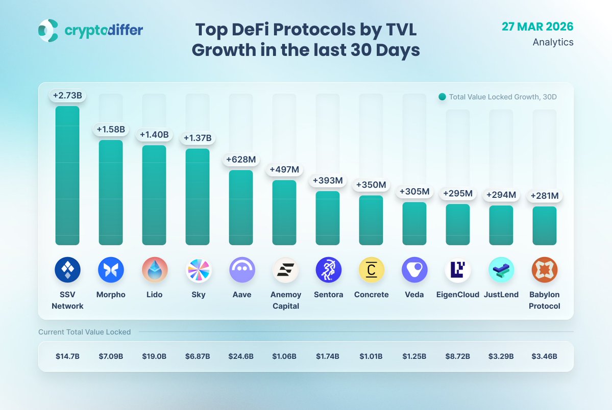 The fastest growing DeFi protocols by TVL include: the distributed ETH staking infrastructure protocol @ssv_network, the decentralized lending and yield optimization protocol @Morpho, and the ETH liquidity staking protocol @LidoFinance.