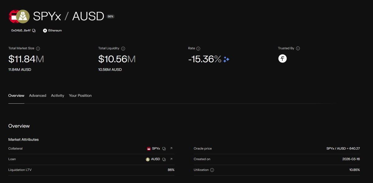 @Morpho The @xStocksFi market on Ethereum offers borrowing rates as high as 15% with SPYx as collateral. There's also $10 million available for lending. It's also great to see @flowdesk_co managing this market.