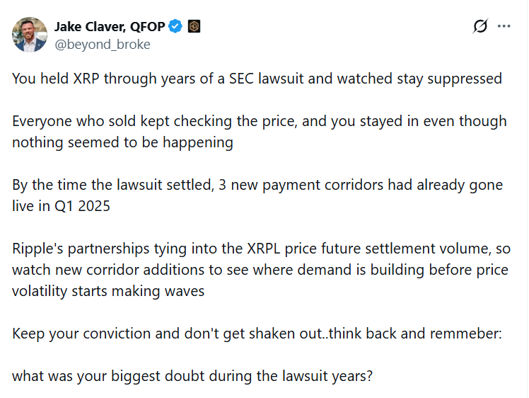 Expert Jake Claver stated that XRP's fundamentals are steadily strengthening, and investors should maintain confidence. #Ripple Claver urged XRP holders to remain resilient and ignore short-term volatility. He reviewed the SEC's lawsuit against Ripple, noting the company's continued growth, even launching three payment channels ahead of the first quarter of 2026. He advised investors to focus on market acceptance trends rather than reacting to price declines. Ripple continues its global expansion, integrating payment, custody, fund management, and RLUSD functions, and is expanding its user base in markets such as Brazil.