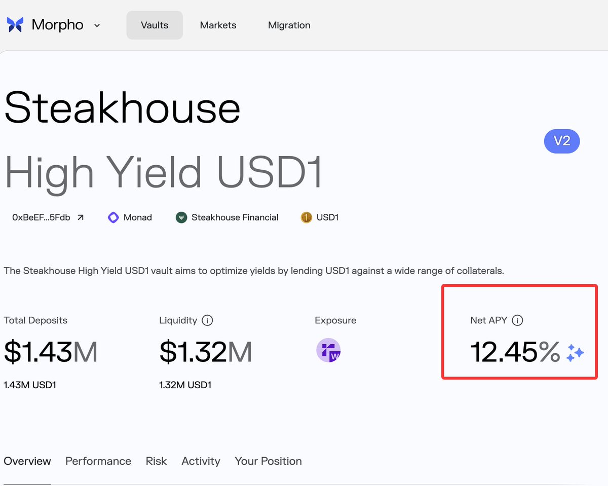 My largest holdings are currently held on exchanges, earning stablecoin yields. It's very stable and safe. But honestly, I'm a little tempted. I've researched some on-chain financial products with yields exceeding 10%, but those were all small investments, not large ones. Mainly because of the issue that broke out with on-chain financial products today, I'm starting to have some reservations. When will a stable and safe 10% yield path fall into my lap? And as expected, God heard my plea and sent me one immediately. It's related to USD1, offering an annualized return of 12.45%, which is already higher than the USD1 holding yield on exchanges. And the reliability should be even greater. 1. It partners with WLFI and USD1. 2. Monad's blockchain background is also good. 3. Currently, the TVL is over 1 million. If you invest around $100,000, you can earn $5,000 per month, which is much better than working a regular job. Bear markets are suitable for passive income. Volatile markets are suitable for financial products. Stability and reliability = passive income. This should be everyone's dream life.