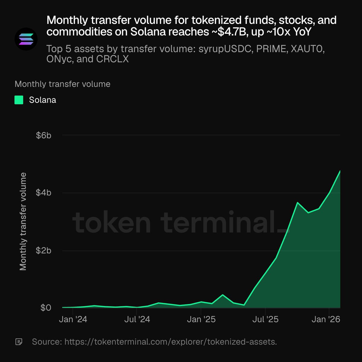 @solana's platform saw monthly trading volume of approximately $4.7 billion for tokenized funds, stocks, and commodities, representing a year-over-year increase of about 10 times. The top five assets by trading volume are: syrupUSDC, PRIME, XAUTO, ONyc, and CRCLX. See the chart below 👇