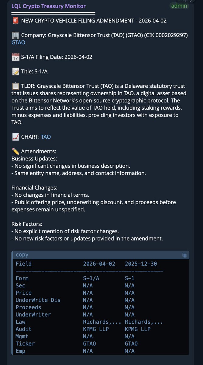 U.S. Securities and Exchange Commission (SEC) filing update: @Grayscale has filed an S-1/A amendment to its @bittensor trust application. $TAO - The following changes are from the LQL filing change report.