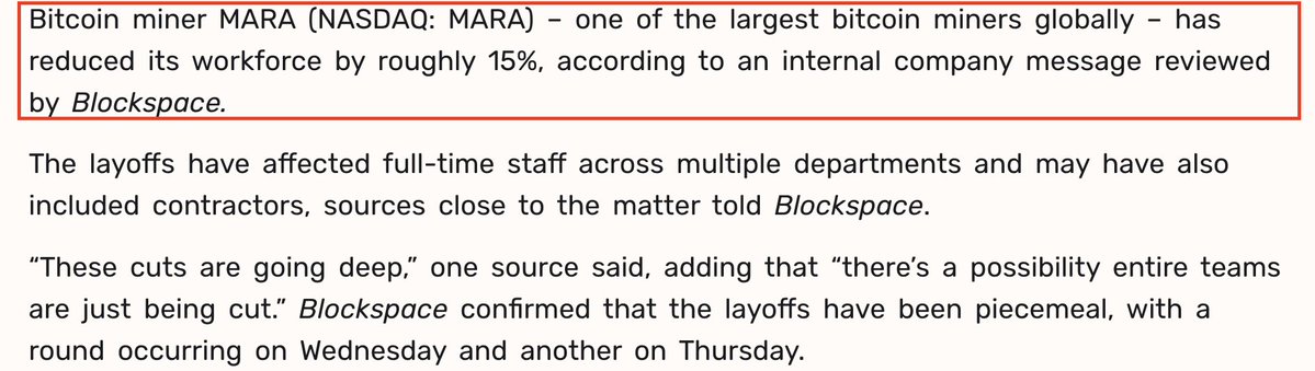MARA Lays Off 15% of Employees as it Transforms into Energy and Infrastructure Businesses According to Blockspace, MARA, one of the largest publicly traded Bitcoin miners in the U.S., has laid off approximately 15% of its workforce across multiple divisions as part of a strategic shift towards energy and digital infrastructure. The company projects a net loss of approximately $1.3 billion by 2025 and has already sold over 15,000 bitcoins to repay convertible bonds.