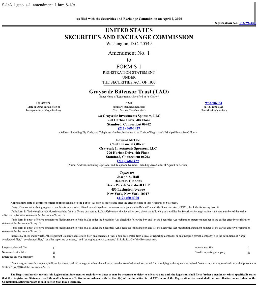 Grayscale has filed an S-1 amendment to its Bittensor ($TAO) Trust with the U.S. Securities and Exchange Commission.