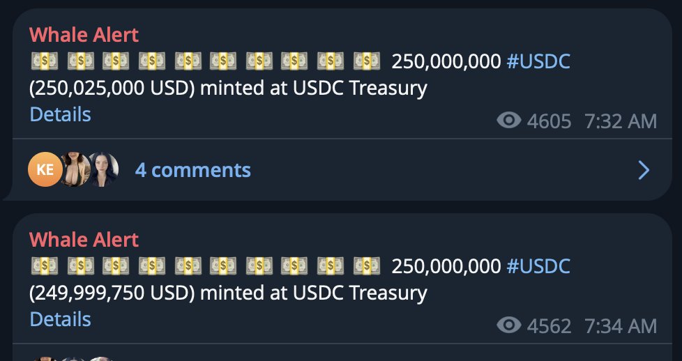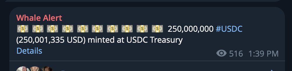 💵 💵 💵 💵 💵 💵 💵 💵 💵 250,000,000 #USDC (worth US$250,001,335) minted by the USDC Treasury.