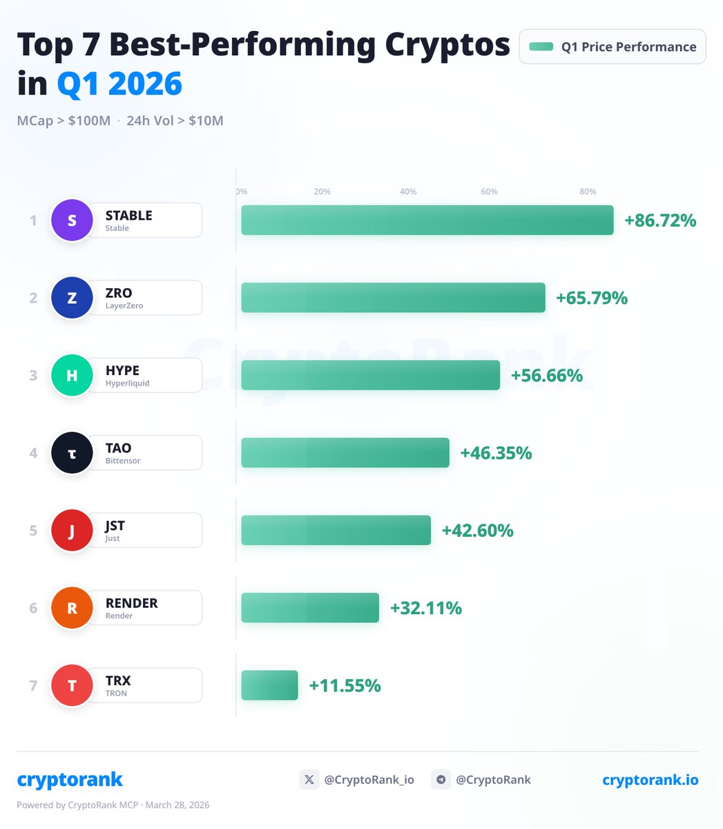📊Market: Top 7 Cryptocurrencies by Q1 2026 $STABLE +86% $ZRO +65% $HYPE +56% $TAO +46% $JST +42% $RENDER +32% $TRX +11% Notably: $Tron was the only cryptocurrency in the top ten to achieve positive growth in Q1 2026.