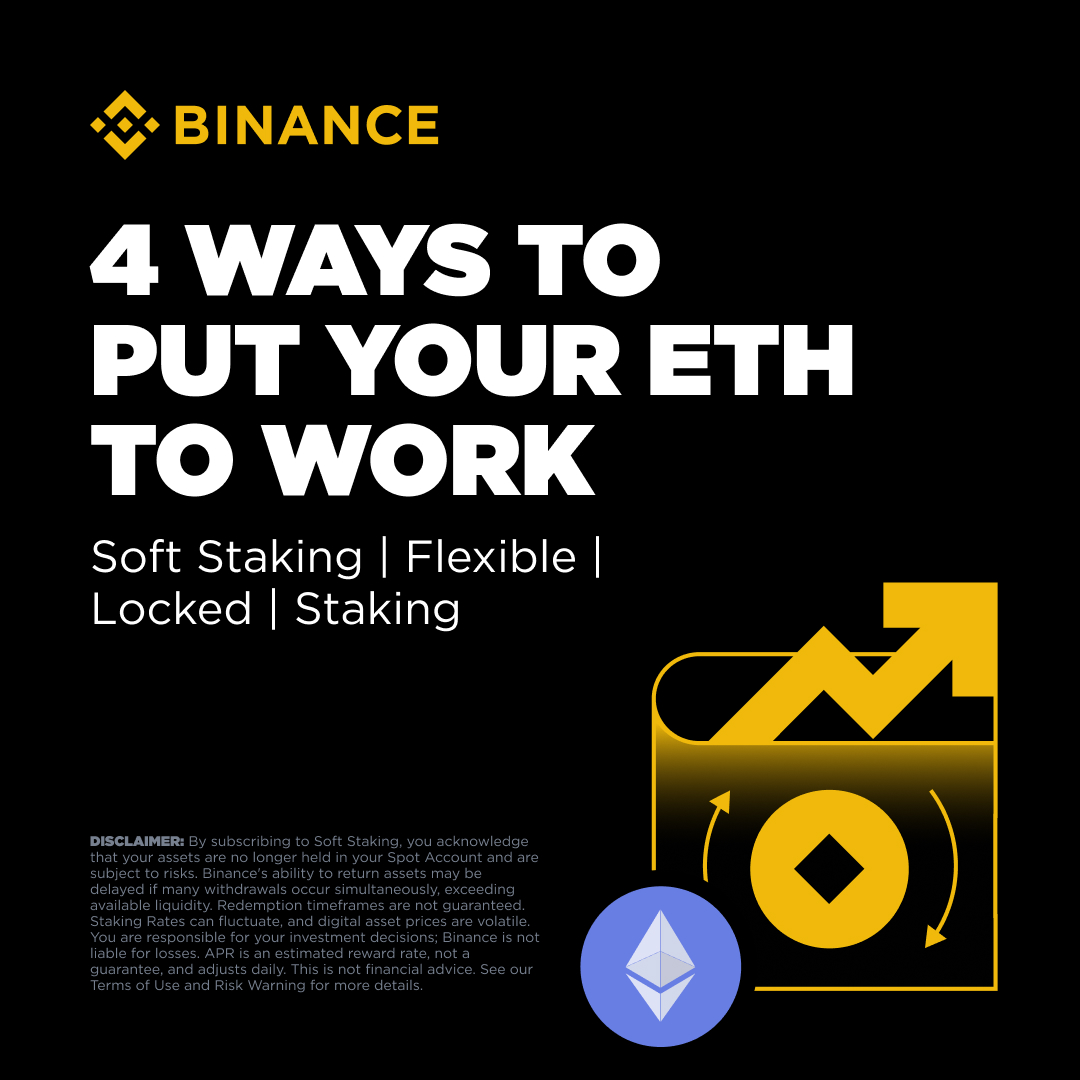Do you have idle ETH in your spot account? Four easy ways to make it generate returns for you. Find the option that best suits your strategy on Binance Earn. 👉 With Binance Soft Staking, you can keep your assets in your spot account while earning rewards. Redeem anytime. Choose from 15, 30, 60, or 90 days. Exchange ETH for WBETH. Grow your assets with an annualized yield of up to 2.6%. Your ETH shouldn't sit idle; it should generate returns for you.