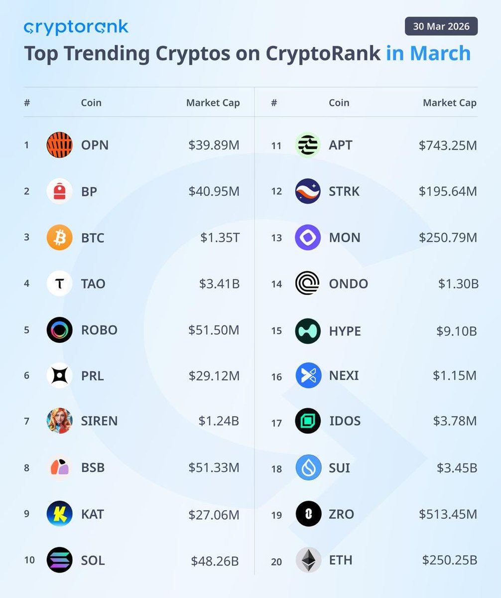 🔥 March CryptoRank Top Cryptocurrencies Ranking Despite a weak market, artificial intelligence, prediction, and cryptocurrencies still dominate. $OPN led the pack this month, followed closely by $BP and $BTC. $TAO, $SIREN, and $HYPE also climbed to the top of the list thanks to their growth this month.