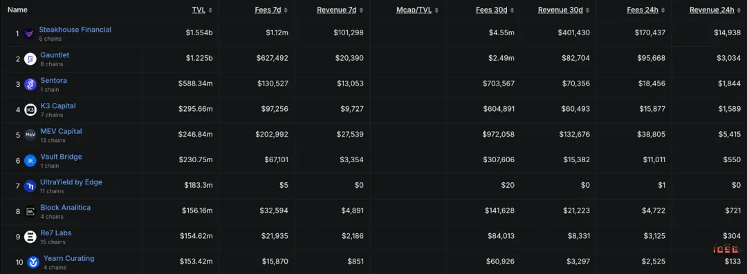 AUM is highly concentrated, with Steakhouse Financial at the top and Gauntlet at the top, accounting for approximately $1.55 billion and $1.23 billion respectively. The top two together account for nearly 50% of the market share, which is a very typical power-law structure.
