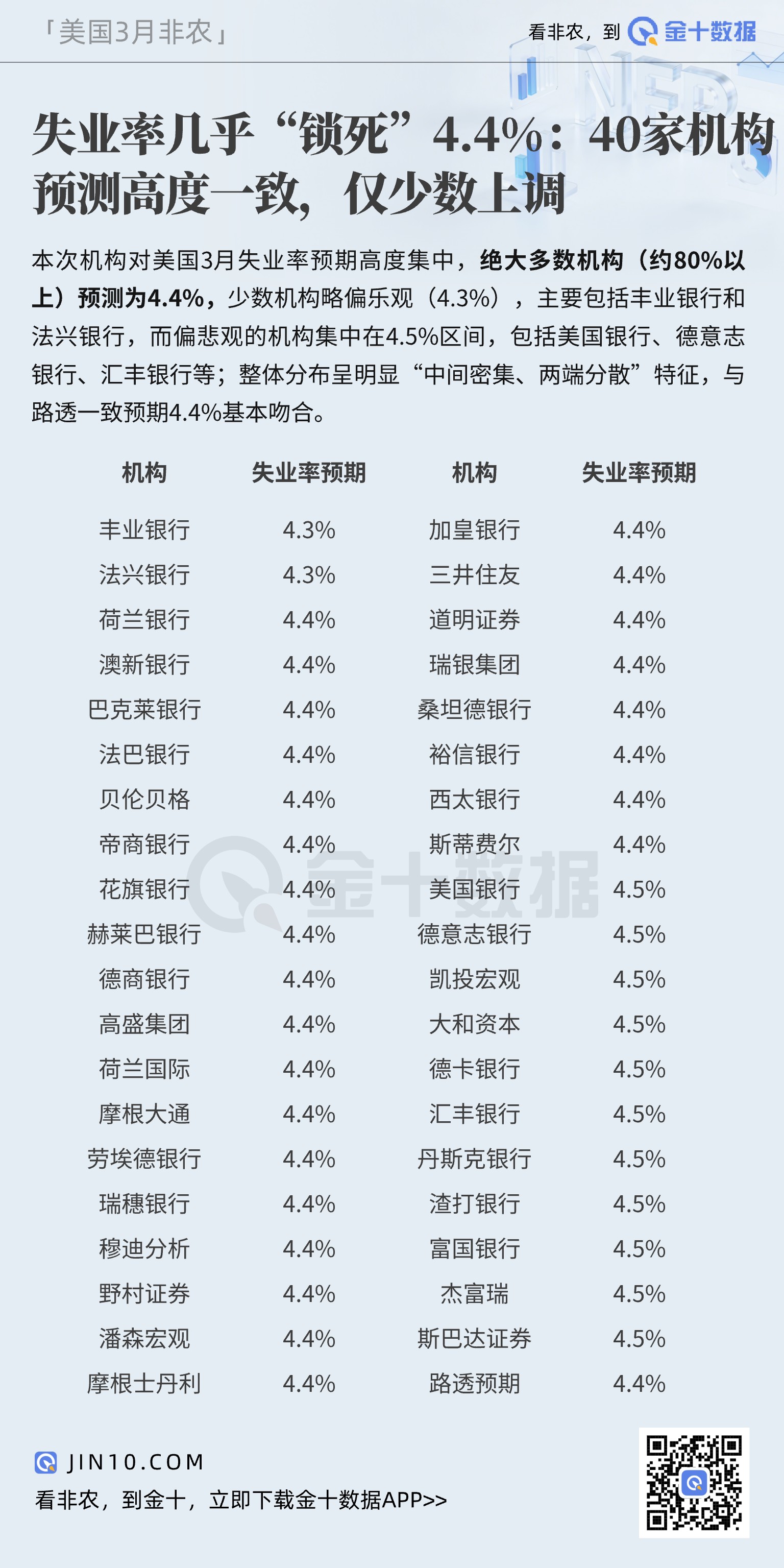 The forecasts for the US unemployment rate in March are highly concentrated among institutions, with the vast majority (over 80%) predicting 4.4%.