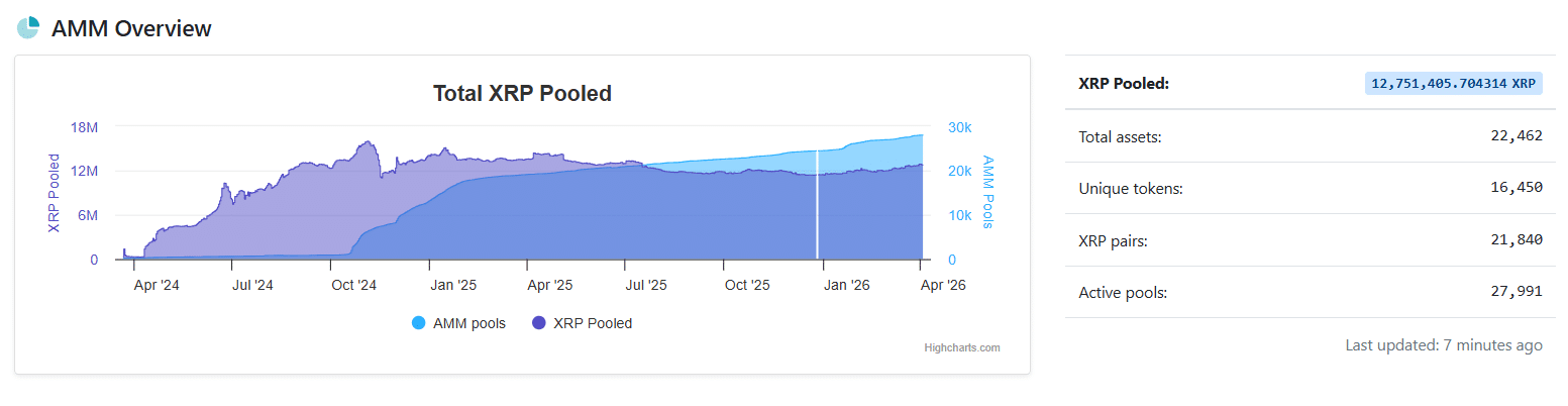 The network now has 27,991 active AMM pools, with 22,462 assets and 16,450 unique tokens. Out of the active trading pairs, 21,840 pairs involve XRP, with about 12.751 million XRP currently locked across these pools.