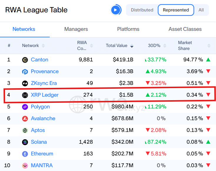 • XRPL already holds $2 billion in real-world assets and $1.5 billion in represented RWAs, ranking among the top networks.