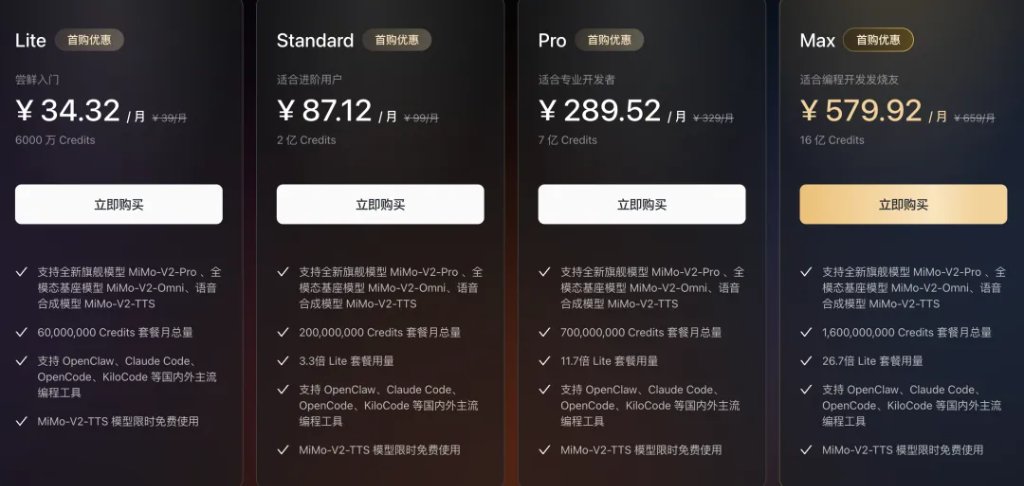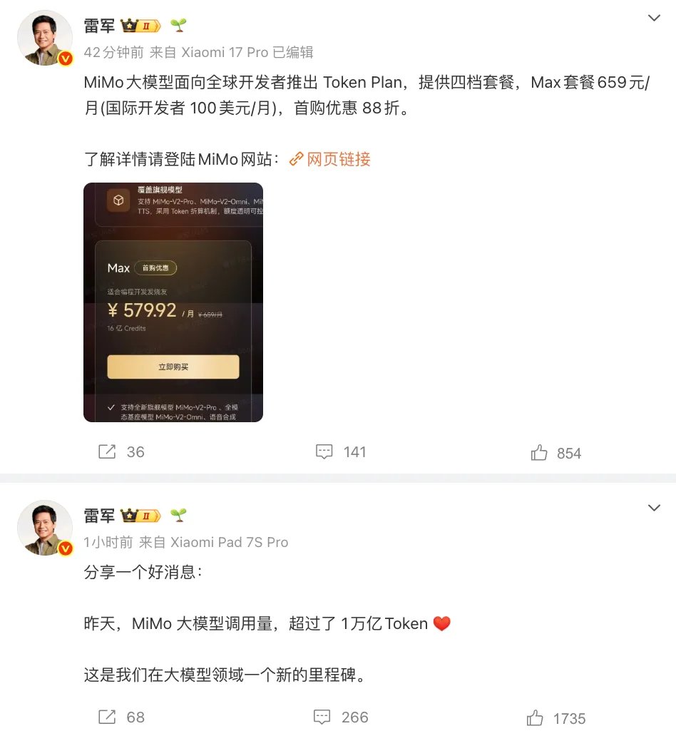 Lei Jun launched Xiaomi's MiMo Token Plan subscription-based API packages, with four tiers ranging from 39 yuan to 659 yuan per month, and a 12% discount for first-time purchases. The subscription packages do not have a 5-hour token usage limit, allowing for concentrated token consumption for intensive tasks like "raising lobsters" (a term used in online games) or programming. Netizens are calling it too expensive, saying even the second tier of 99 yuan isn't enough for "raising lobsters."