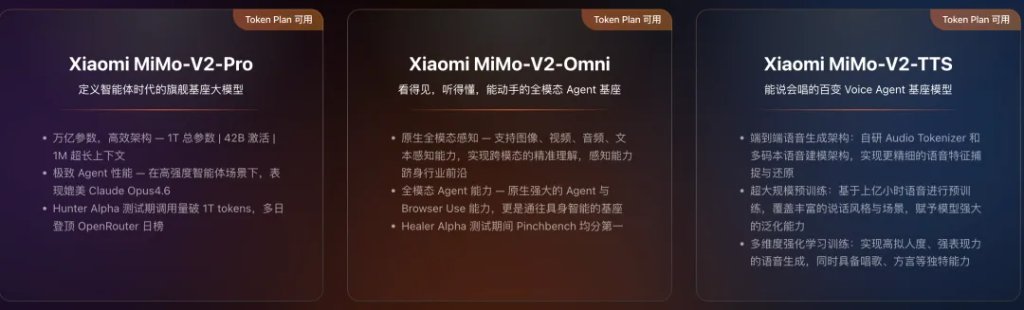This package supports flagship base large models.MiMo-V2-ProFull-modal intelligent agent base modelMiMo-V2-OmniVoice-based intelligent agent base modelMiMo-V2-TTSThe model is compatible with mainstream development toolchains such as OpenCode, OpenClaw, and Claude Code.