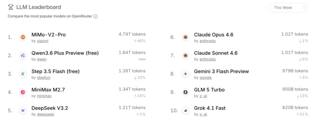 This week, MiMo-V2-Pro topped the list of API calls on OpenRouter, the world's largest API aggregation platform, surpassing a host of mainstream models including Claude, Alibaba Qianwen, Google Gemini, MiniMax, DeepSeek, and Zhipu.
