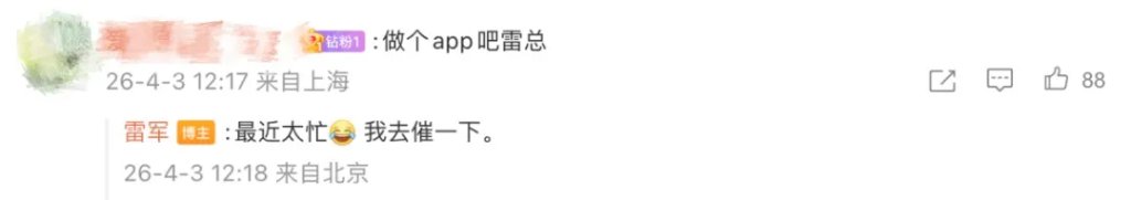 Some netizens called for [something] on Weibo.Xiaomi makes an app,Lei Jun replied, "I'll go and urge them."