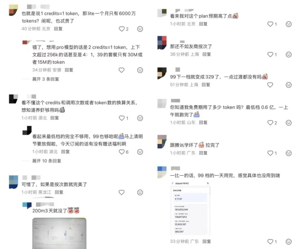 Many netizens exclaimedThe price is too high, and the cheaper packages aren't enough.Some users claimed to have used nearly 400 million tokens in the past two weeks, while others used 130 million tokens in 5 days. Based on the token-to-credit ratio, even the lowest tier of Xiaomi MiMo Token Plan's 39 yuan package and the second tier's 99 yuan package are insufficient to "raise lobsters." They also compared it to Tencent's local shrimp program, QClaw, which currently gives away free tokens every day.