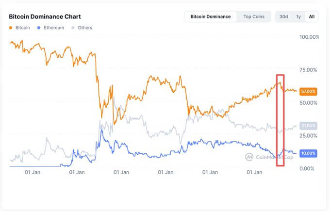 This is because while the total market capitalization of altcoins is growing, there are simply too many altcoins, resulting in most individual altcoins not experiencing a significant price increase.
