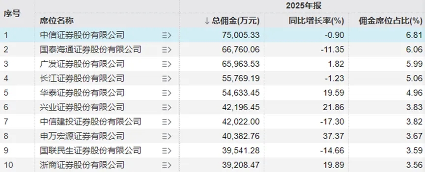 According to WIND data, CITIC Securities maintained its top position with total commissions of 750 million yuan. Although this represents a slight year-on-year decrease of 0.90%, its dominant lead remains unshaken. Guotai Haitong Securities, GF Securities, and Changjiang Securities followed closely behind, occupying second, third, and fourth place respectively. The top four positions remained unchanged from the previous year, demonstrating the stability of the "top-tier" group.