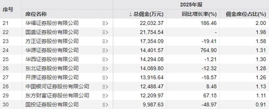 The rankings of brokerage commissions, from 21st to 30th, exhibit a near-rebirth-like fluctuation.