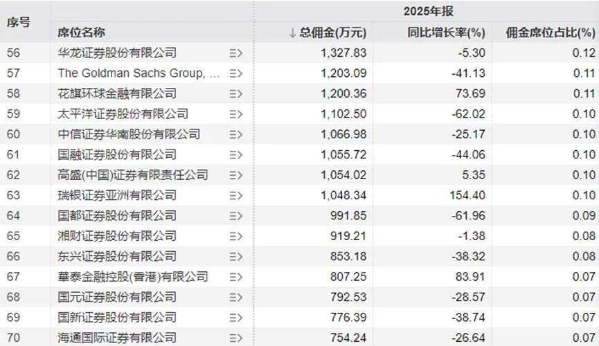 Following closely behind is China International Capital Corporation (International), which maintained a high growth rate of 72.77%, firmly holding its position in the second tier. Both demonstrate that leading Chinese institutions, through their internationally-oriented positioning, are fully capable of carving out high-value niches in a competitive market. In contrast, Haitong International Securities served as the "control group," recording only RMB 7.5424 million in commissions and a negative growth of -26.64%, ranking 70th.