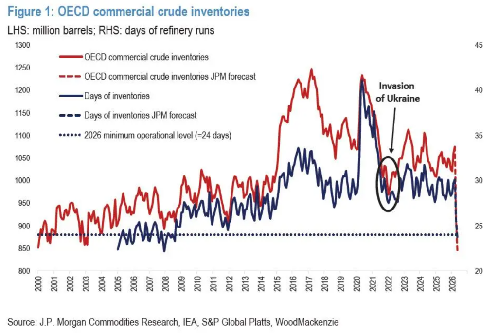 In early April, JPMorgan commodity analyst Natasha Kaneva released a new report that systematically calculated the rate at which global crude oil inventories were depleted under the impact of the Strait of Hormuz blockade, and provided a complete timeline from "bottoming out" to "rebuilding." The conclusion is straightforward: the inventory buffer is being rapidly depleted, and the market is not far from its "operating minimum"—it may bottom out in May.