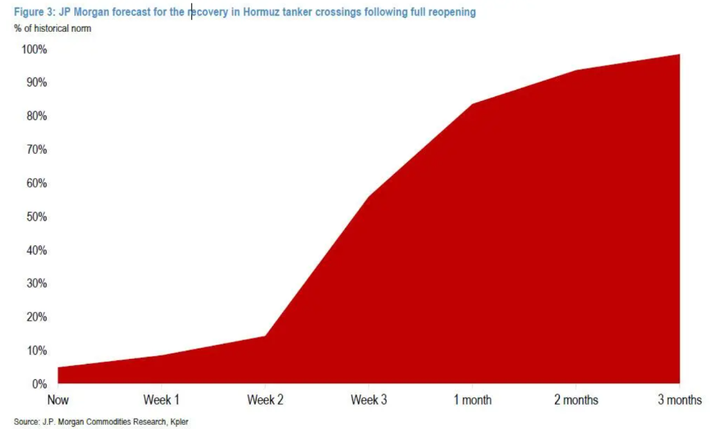 Even if the strait reopens, supplies won't immediately resume. JPMorgan Chase has outlined a three-phase plan: