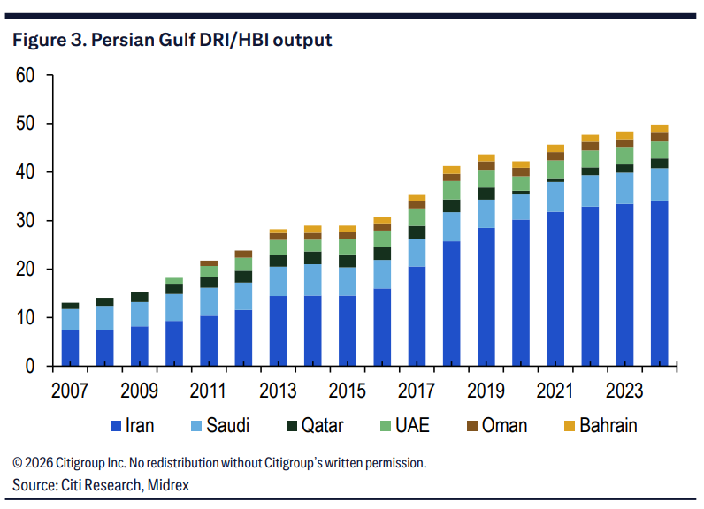 Citibank estimates thatIf Iran's 34 million tons of gas-based DRI production were fully replaced by blast furnace capacity in other parts of the world, it would generate an additional demand for approximately 20 million tons of coking coal, equivalent to 8% to 10% of the global seaborne coking coal market.