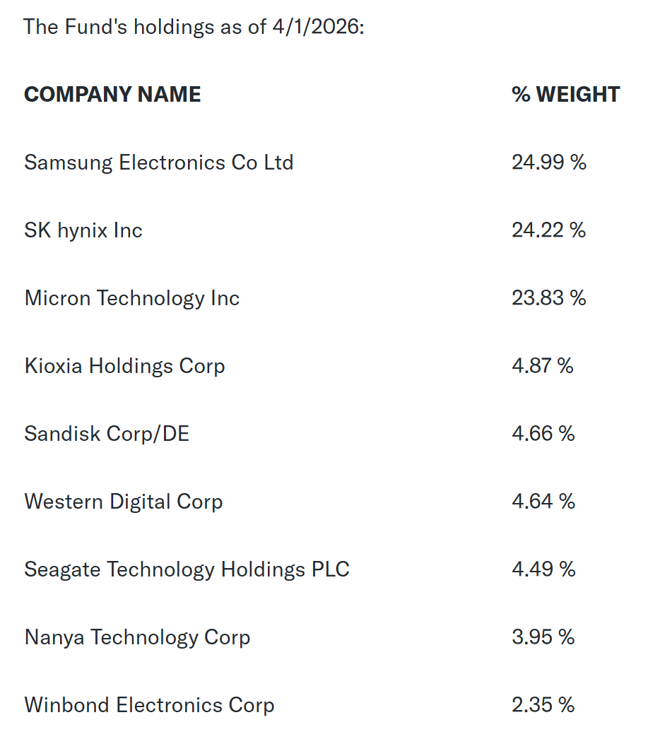 The remaining holdings are spread across Kioxia Holdings (4.87%), Sandisk (4.66%), Western Digital (4.64%), Seagate Technology (4.49%), Nanya Technology (3.95%), and Winbond Electronics (2.35%).