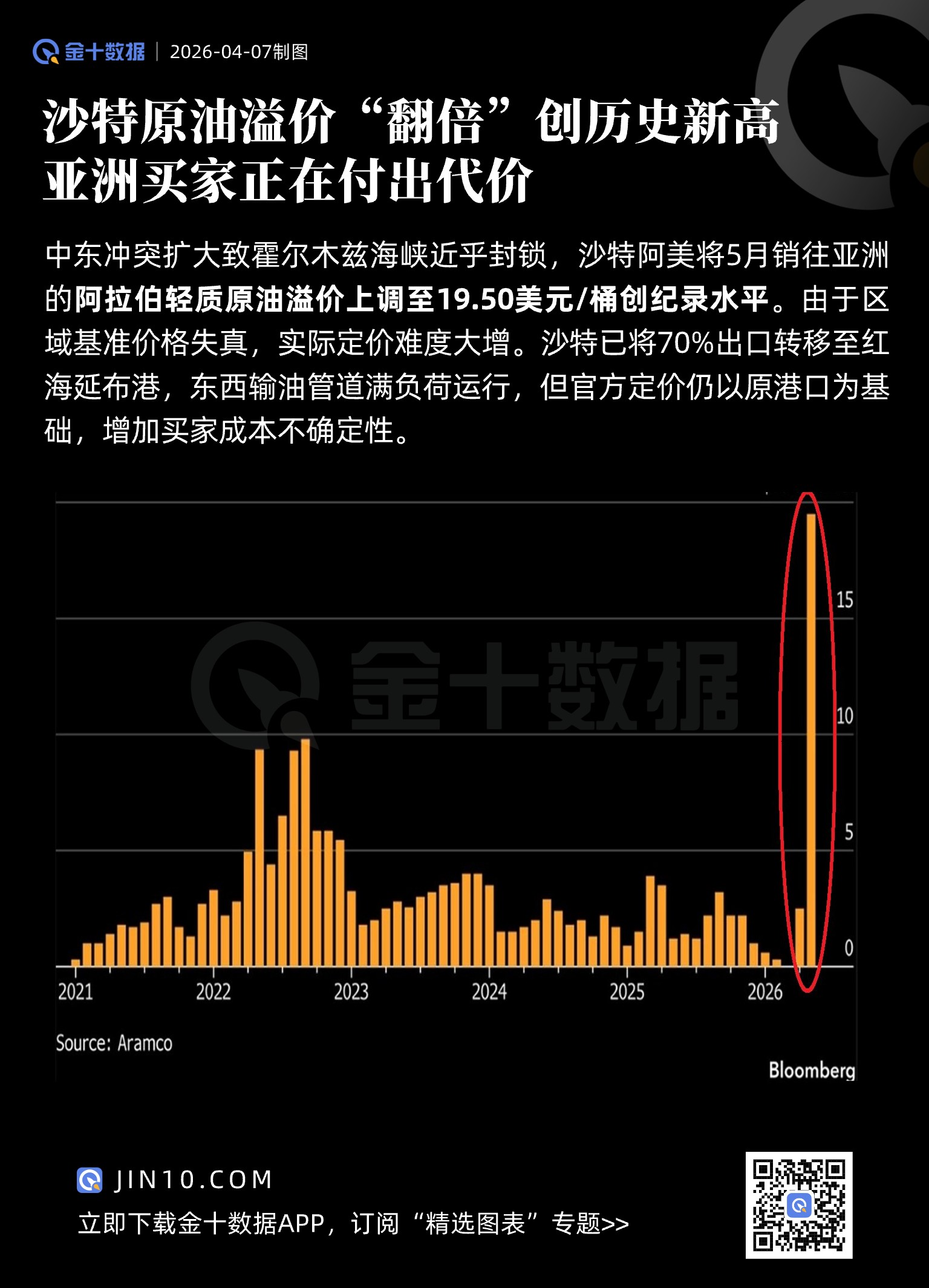 The escalating conflict in the Middle East has brought the Strait of Hormuz to near-blockade, prompting Saudi Aramco to raise the premium for its Arab Light crude oil shipments to Asia in May to a record high of $19.50 per barrel.