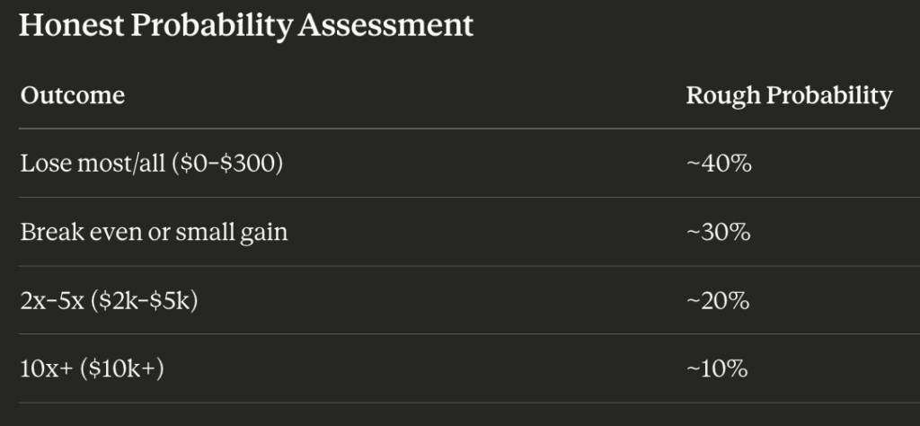 Despite the structured approach, Claude AI assigns a 40% chance of major losses, a 30% likelihood of breaking even or achieving modest gains, and just a 10% probability of reaching the $10,000 target.