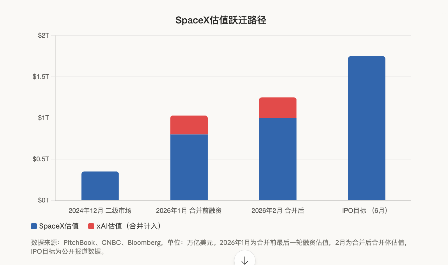 In February of this year, SpaceX completed its merger with Elon Musk's AI company xAI in an all-stock transaction. At the time of the transaction, SpaceX was valued at approximately $1 trillion, xAI at approximately $250 billion, and the combined entity was valued at approximately $1.25 trillion. According to Bloomberg Intelligence estimates, the combined company's revenue in 2026 will be close to $20 billion, with xAI contributing less than $1 billion.