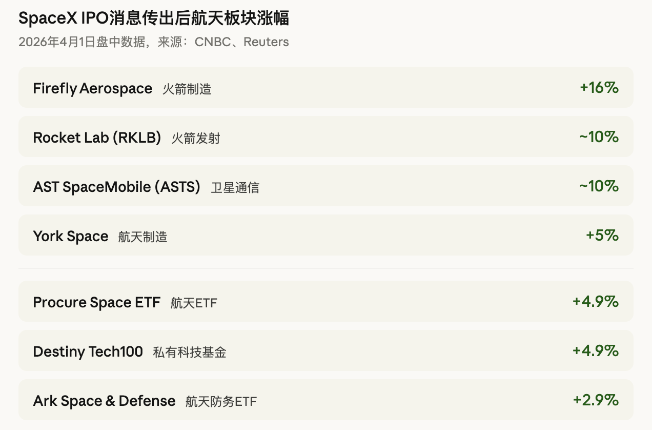 On the day the news broke, the aerospace sector saw widespread gains. According to CNBC, AST SpaceMobile and Rocket Lab rose nearly 10%, Firefly Aerospace, the rocket manufacturer that went public last August, surged 16%, and York Space, which went public this January, rose 5%. Reuters reported that ETFs tracking the aerospace sector also strengthened, with Ark Space & Defense Innovation rising 2.9%, Procure Space rising 4.9%, and the Destiny Tech100 fund, which invests in unlisted technology giants, rising 4.9%.