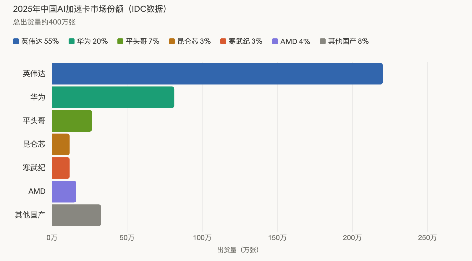 Deep Tide Guide:According to IDC data, China's total shipments of AI accelerator cards will reach approximately 4 million units in 2025, with domestic manufacturers delivering a total of 1.65 million units, accounting for 41% of the market. Nvidia's market share has fallen from approximately 95% before the sanctions to 55%.