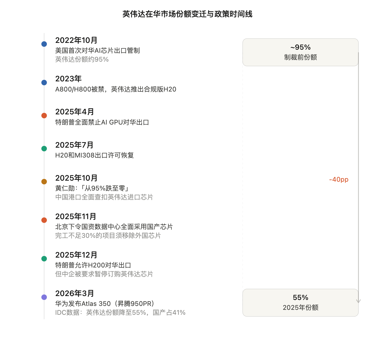 The timeline is roughly as follows: The US restricted AI chip exports to China starting in October 2022. Nvidia subsequently launched compliant, downgraded versions of the H20 and A800/H800 products. In April 2025, the Trump administration imposed a complete ban on all AI GPU exports to China; in July of the same year, export licenses for the H20 and AMD MI308 were reinstated; in October, Nvidia CEO Jensen Huang stated publicly that Nvidia's market share in China's advanced AI accelerator card market "fell from 95% to zero." In December, Trump allowed Nvidia to export the H200 to China, but Chinese companies were told to suspend orders for Nvidia chips.