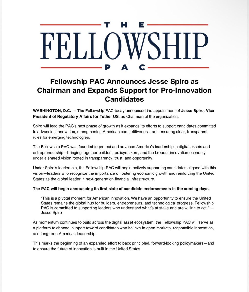 According to a Cointelegraph report on April 1, the Fellowship PAC announced on Wednesday that Jesse Spiro, Vice President of Regulatory Affairs at Tether US, will serve as the organization's chairman, leading its next phase of expansion. The first list of endorsers will be released in the coming days. Fellowship is a super PAC founded in August 2025, and last September announced it had raised "more than $100 million" from unnamed donors aligned with the crypto industry.