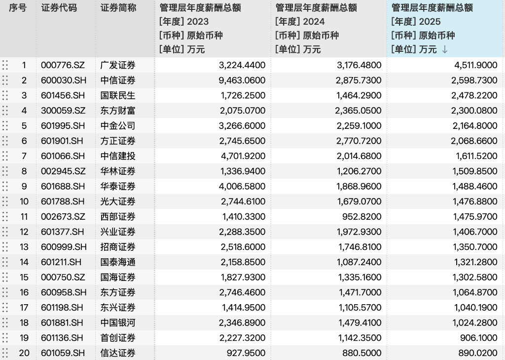Guangfa Securities, with its relatively good management and high level of marketization, had a relatively generous total management compensation in 2025 (see chart below).