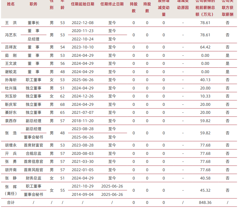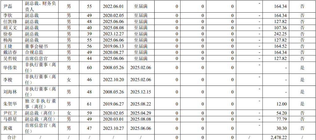 The company president, Zhu Jiangtao, received a salary of 1.3712 million yuan, while the vice president, compliance director, and chief risk officer, Zhang Xing, received 1.4 million yuan. Vice president Wang Zhijian received 1.0638 million yuan. All three were appointed within the year, and their total salaries may not reflect all aspects of the compensation package.