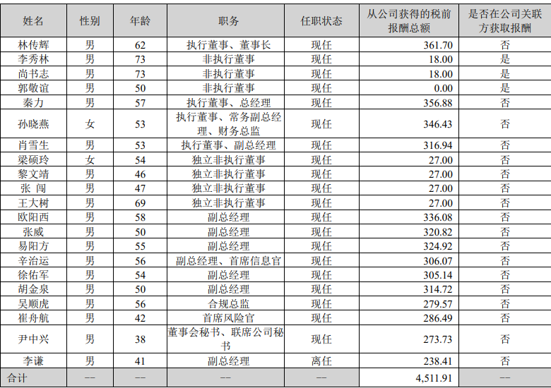 Specifically, Chairman Lin Chuanhui received pre-tax compensation of 3.617 million yuan, and General Manager Qin Li received 3.5688 million yuan. Executive Director and Vice General Manager Xiao Xuesheng received 3.1694 million yuan, and Vice General Manager Hu Jinquan received 3.1472 million yuan. Other vice general managers such as Ouyang Xi, Zhang Wei, and Yi Yangfang received similar compensation. Overall, the salaries of senior executives at GF Securities are relatively close, with little difference between them.