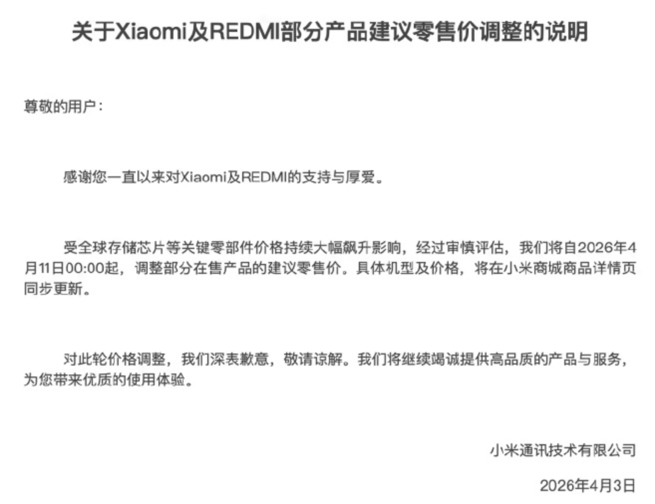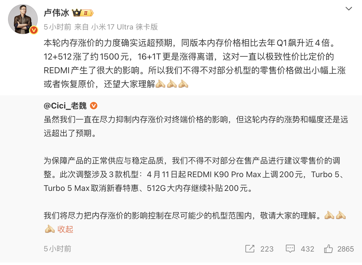 Wei Siqi, General Manager of Xiaomi China Marketing Department, posted on Weibo that the company had been working hard to curb the impact of memory price increases on terminal prices, "but the rise and magnitude of this round of memory price increases still far exceeded expectations." She emphasized that this price adjustment was a necessary measure to ensure normal product supply and stable quality.